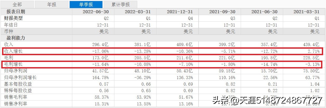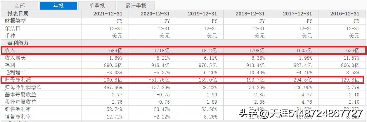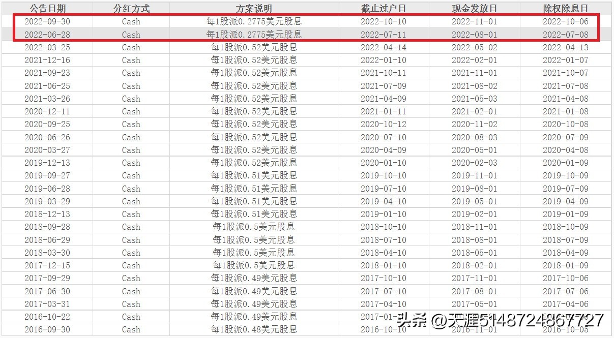 2020年、2021年年报公司营收分别下降5.21%、1.69%,公司毛利分别下降5.37%、3.03%,2018—2020年连续三年归母净利润分别下降34.23%、28.22%、137.23%,2020年归母净利润-51.76亿美元,看着这这数据着实恐怖。2022年一季度和之前的五年每个季度每股分红都在0.5美元左右,2022年中报和三季报每股分红几乎腰斩,每1股派0.2775美元股息,既然分红都大幅降低了,股价也该重新定义一下了。