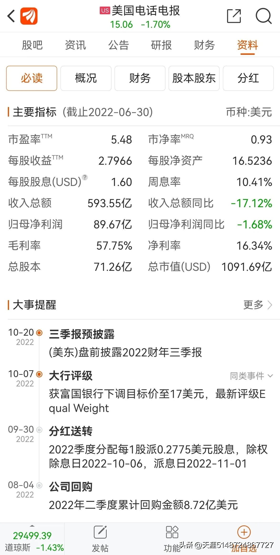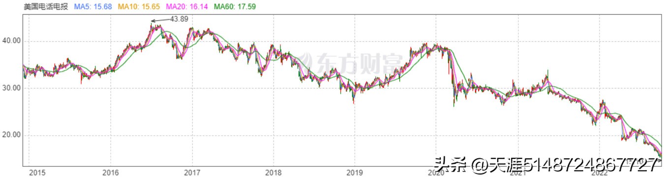 AT&T,美国电话电报公司,通信行业大名鼎鼎的企业,世界范围内也能排上号的,也是美股的实力派。按9月23日收盘价16.01美元计算,2014—2021年股息率回测居然连续八年高于10%,看起来是不是特别夸张?但是,看看公司的股价,从2020年年初接近40美元跌到现在接近15美元,跌幅高达62.5%,还没有看到止跌的趋势。面对低迷的股价,公司2022年二季度累计回购金额8.72亿美元,当然还是螳臂当车无力回天。