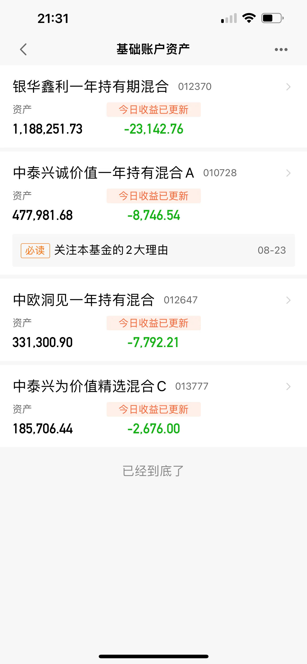 2022.8.24:今天大盘跳水,沪深300指数大跌了1.89%。老王今天亏了8万多,小幅跑赢指数。市场可能被任正非一句话吓到了,股市先让股民感受到寒意。经济不好,预期不好,要不要投资?钱放在手里,存在银行,其实贬值速度挺快的,但是如果自己判断有风险,也可以留部分资金找更低的位置。