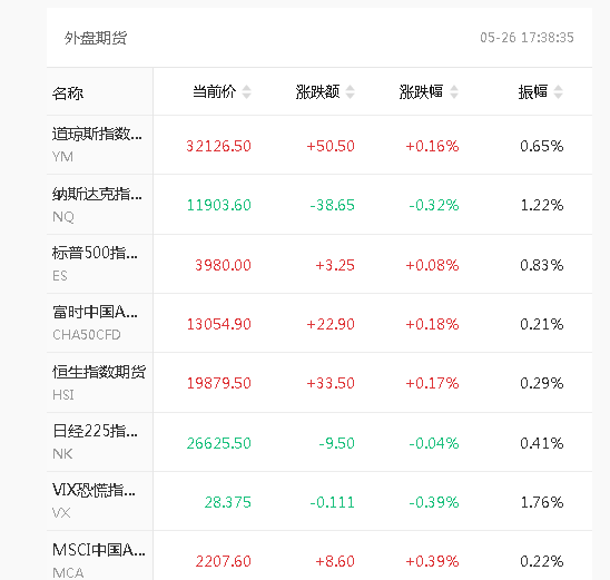 美国股指期货小涨小跌,其中纳斯达克指数小跌0.35%,道琼斯指数小涨0.15%,如下图。