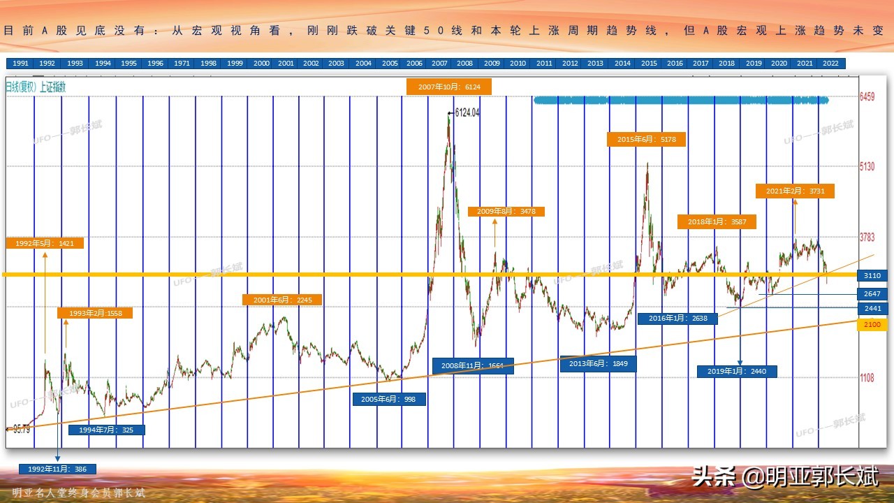 区间放到最大,从“宏观视角”看一下(见图三),自1990年12月至今三十二年间,起始点是1990年12月19日的95.79点,到2007年10月16日历史最高点6124.04点,按这个宏观区间做“黄金分割”分析的话,目前刚刚跌破关键50线,还远远未到下0.618线,而这个关键点位,也恰恰在前面提到的新的箱体下沿附近,可见2450点左右,将是非常重要的支撑点位。