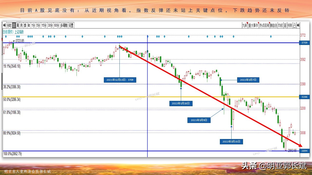 本轮的下跌,从“近期视角”来看(见图一),应该起始于去年的12月13日,从当日最高的3708.94点跌到近期的最低点2863.65点,以此区间采用“黄金分割理论”来分析:2022年1月28日跌破上0.618线,之后反弹涨了回来,记得当时有朋友问我是否见底可以进入了,我说“横盘趋势”(见图二)还未改变,需要再观望;之后3月7日再次跌破上0.618线,3月9日跌破关键的50线,并且跌破了之前的横盘箱体的下沿,说明“下跌趋势”形成;3月15日跌破下0.618线,之后反弹站回后,于4月25日再次跌破,近期低点反弹后,目前处于下0.618线附近,是否能支撑住还有待观望,因此说已经见底还为时过早,趋势一旦形成短期不会反转。