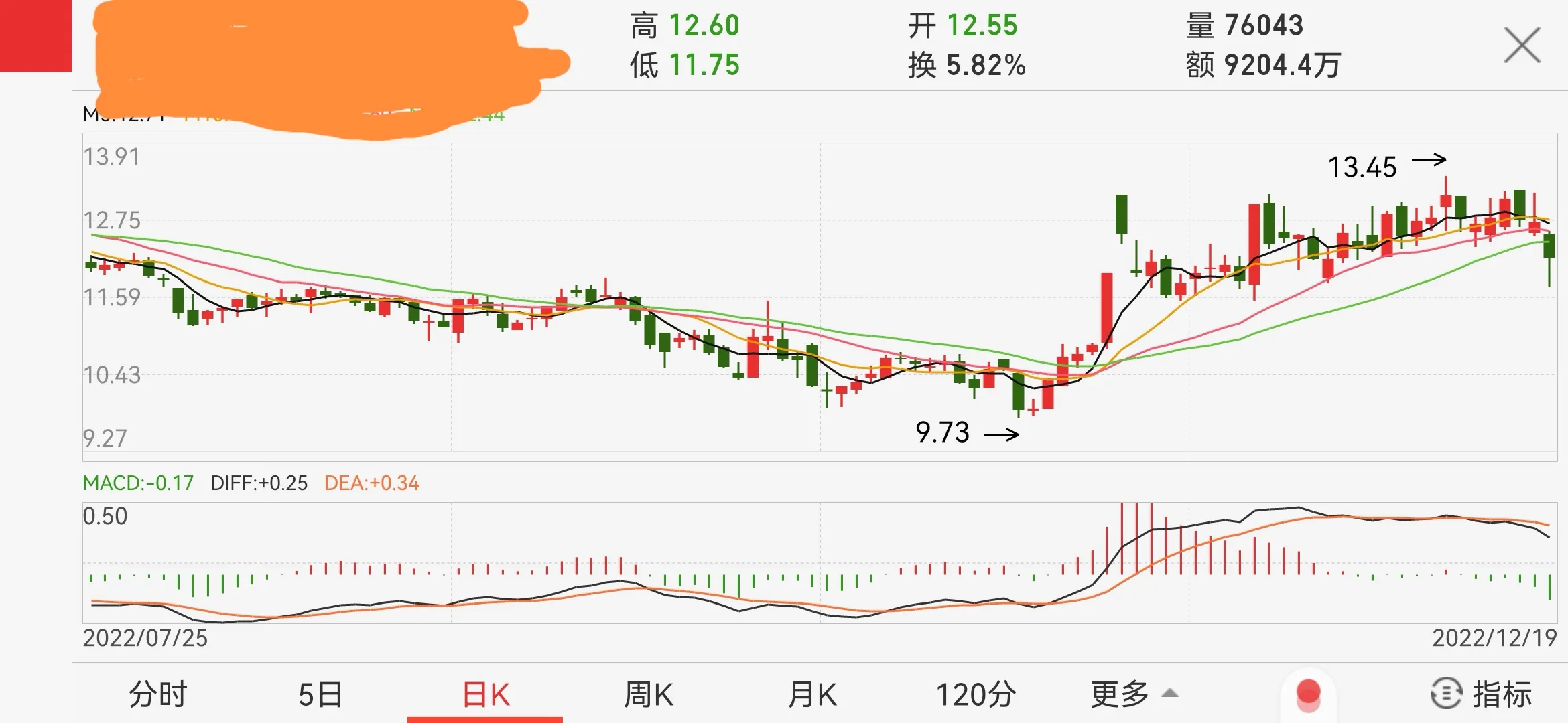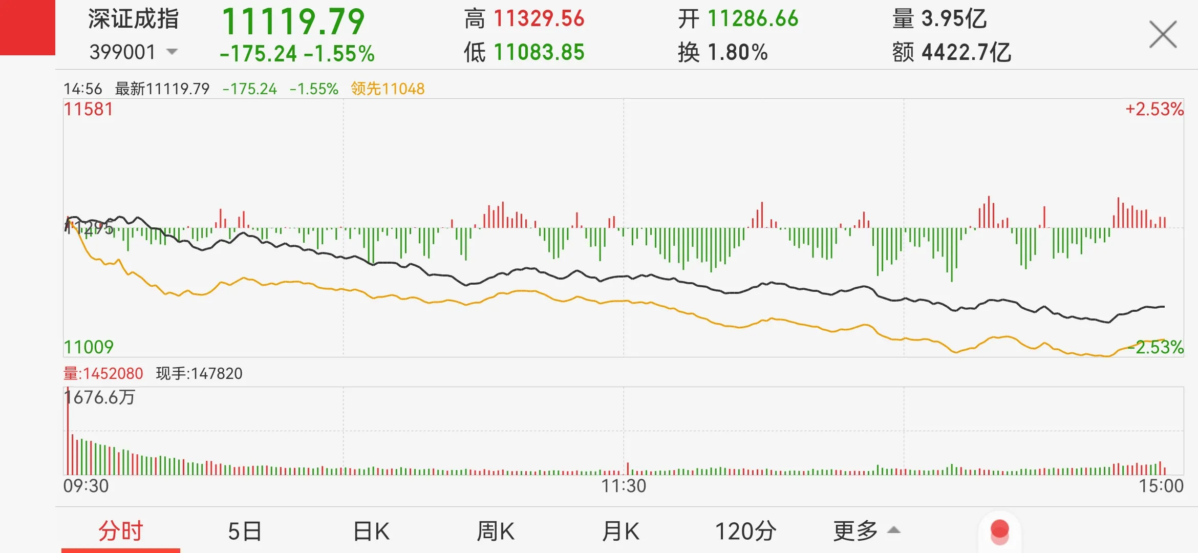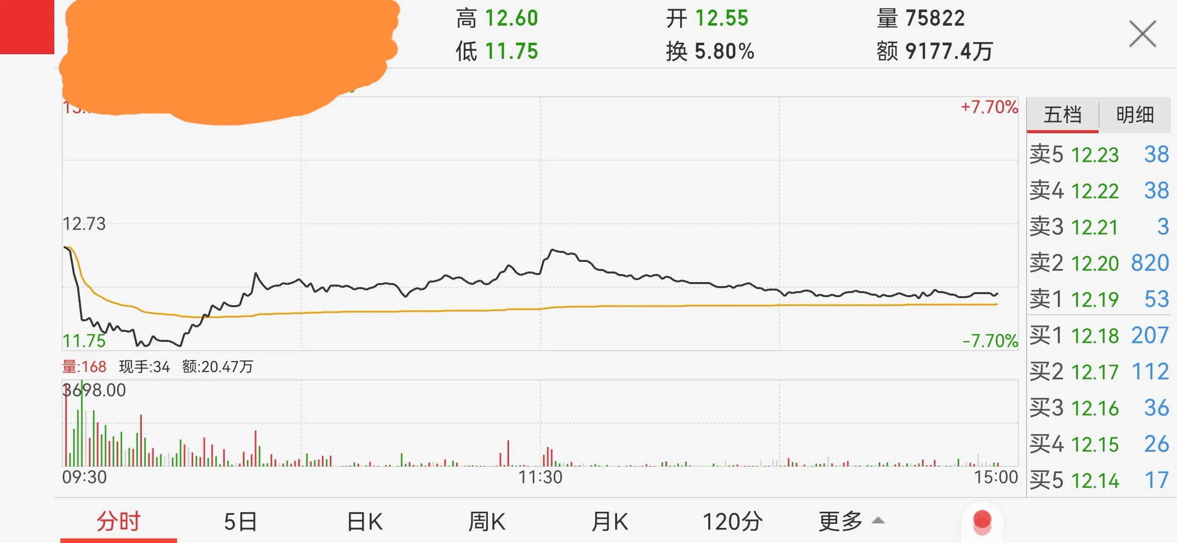 受大盘影响,我的股票也做出弱势下行的方向选择。早盘直接低开,然后快速下行,最低跌幅7个多点。本来高抛观望的计划也没给机会,跌势惨烈。