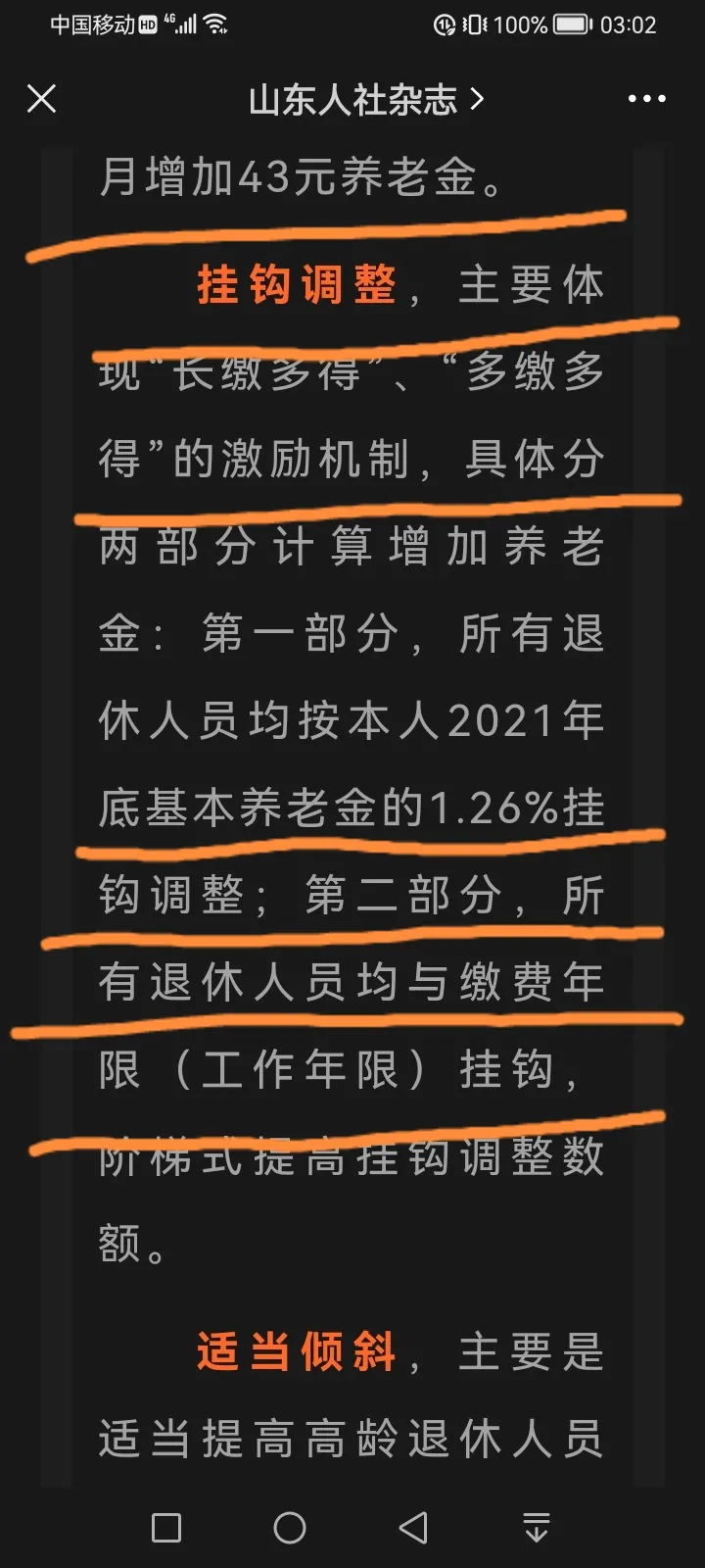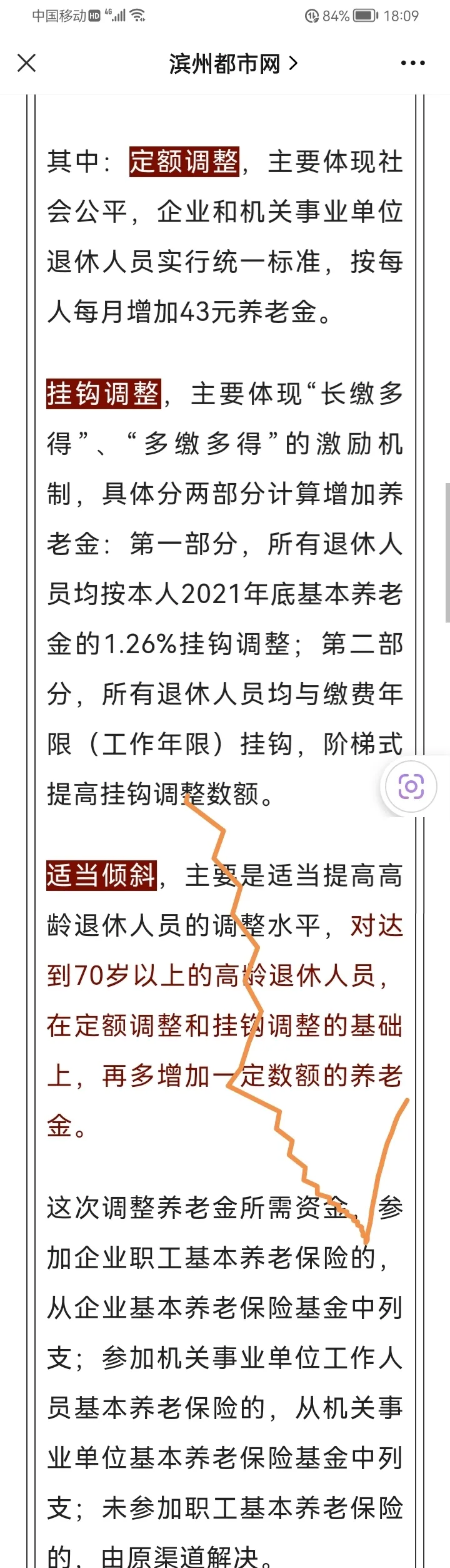 三是,适当倾斜,主要是适当提高高龄退休人员的调整水平,对达到70岁以上的高龄退休人员,在定额调整和挂钩调整的基础上,再多增加一定数额的养老金。