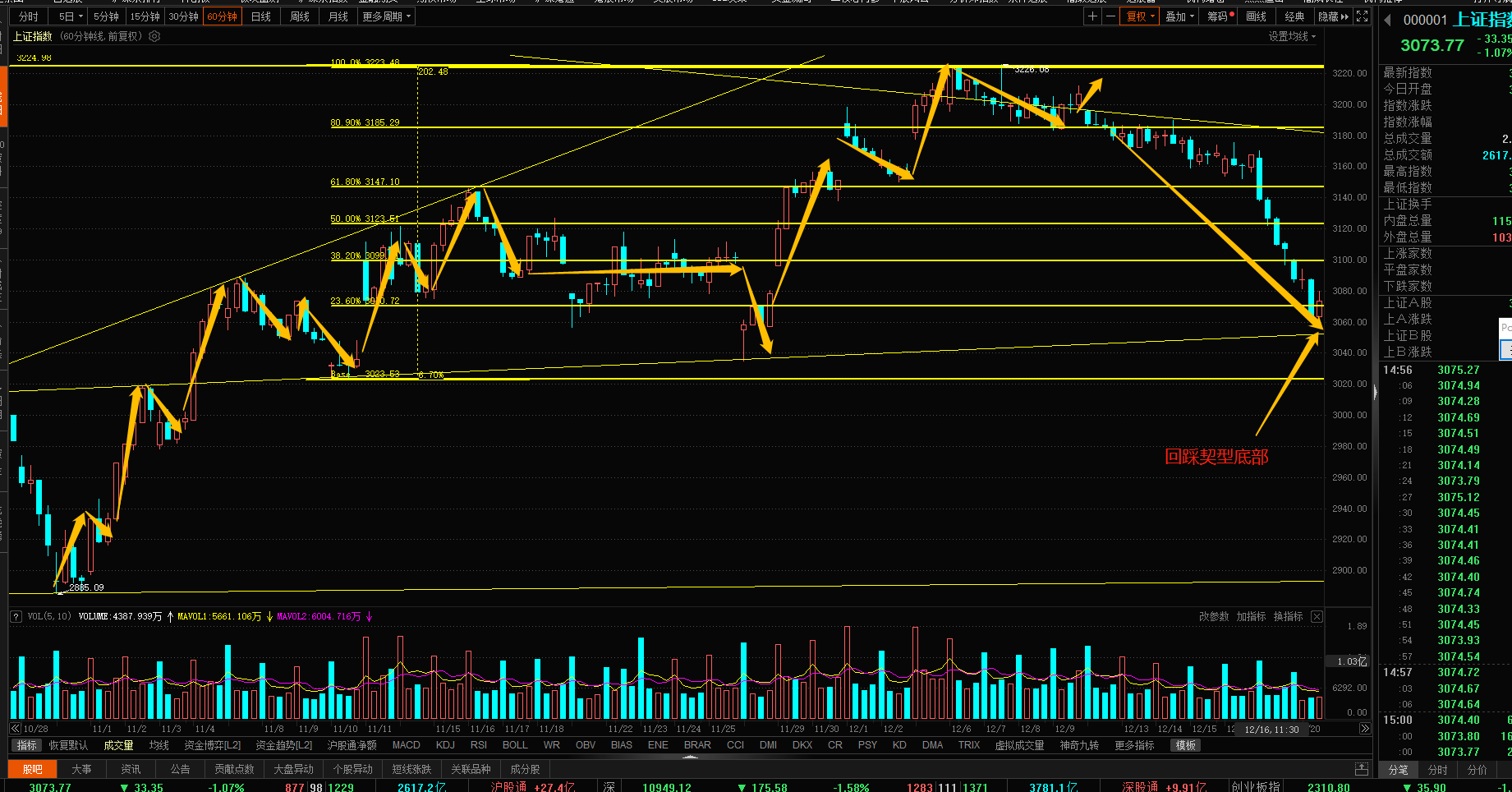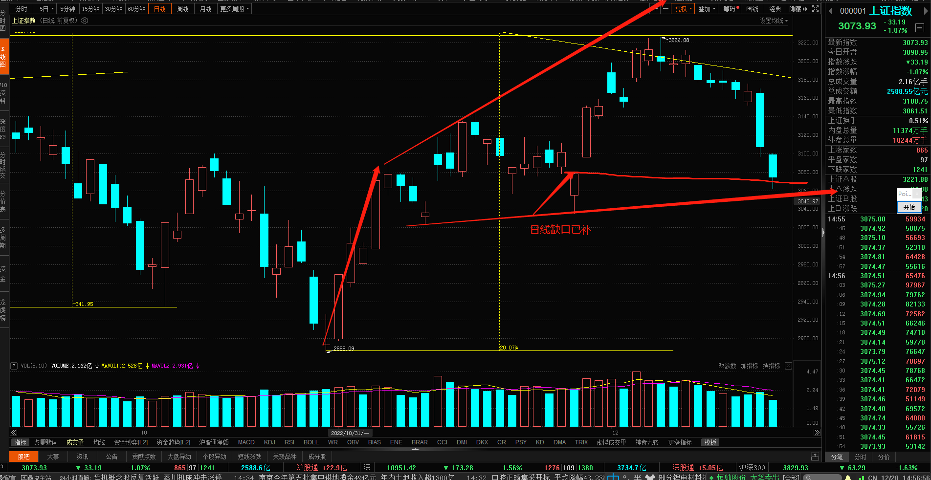 今天大盘在3071点附近我的短线做了加仓,主要是因为从技术面看有两点:第一是大盘已经回补这轮上涨的所有缺口,目前技术面已完成了修复;第二是我目前判断大盘还在小2浪的契型整理阶段,今天正好回踩到了契型的底部支撑线,所以认为短线会有上涨的预期,如果未来跌破3053点,这笔短线交易将宣告失败而止损。如果没有跌破,短线将做个高抛低吸。所以目前判断大盘短期有反弹的需求。可以适当的短线参与。