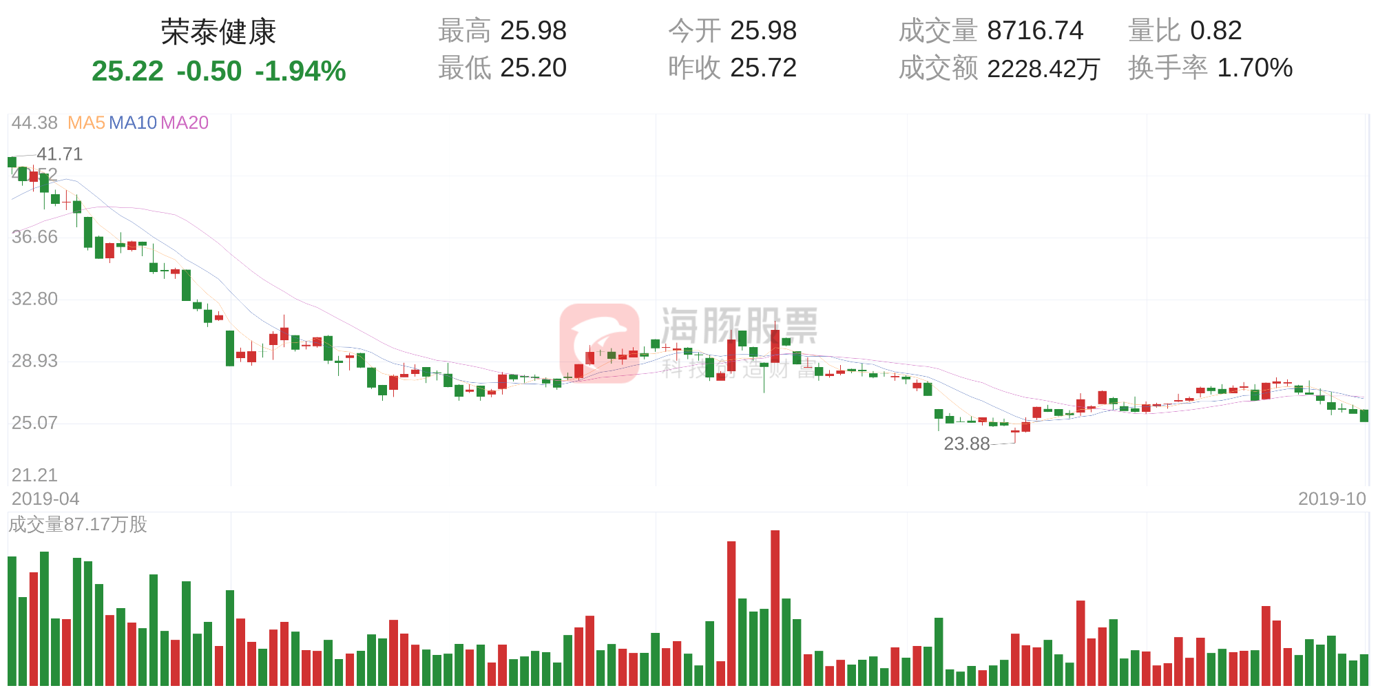 1.荣泰健康今日下跌1.94%,股价为25.22元,成交金额为2228.42万元,成交8,716手,换手率为1.70%。