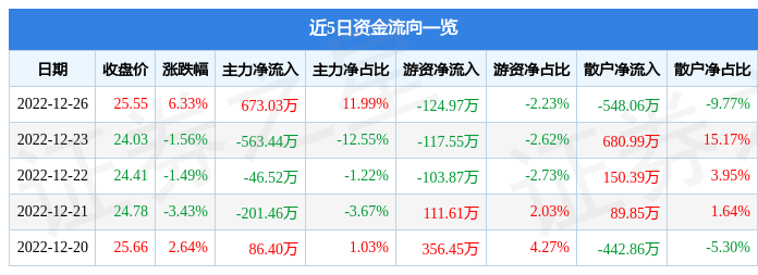 12月26日的资金流向数据方面,主力资金净流入673.03万元,占总成交额11.99%,游资资金净流出124.97万元,占总成交额2.23%,散户资金净流出548.06万元,占总成交额9.77%。