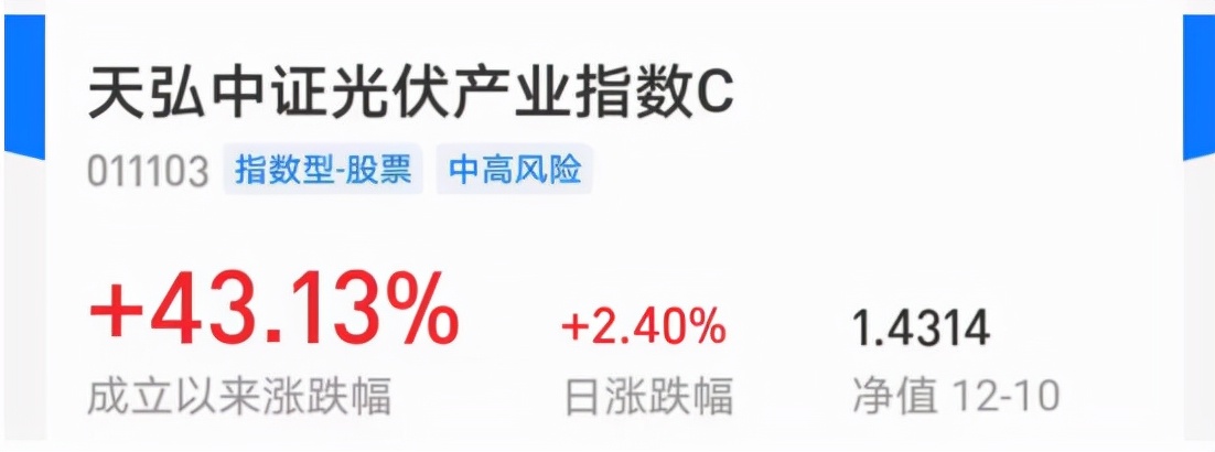首先是历史业绩非常亮眼:天弘中证光伏产业指数C成立以来收益率高达43.13%。