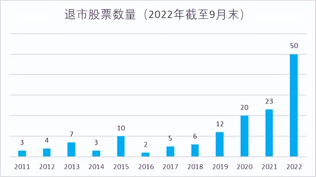 5.退市股票数量截至九月末,今年退市股票共计50支,是20年、21年两年退市股票数之和,更是11年至19年退市股票数之和