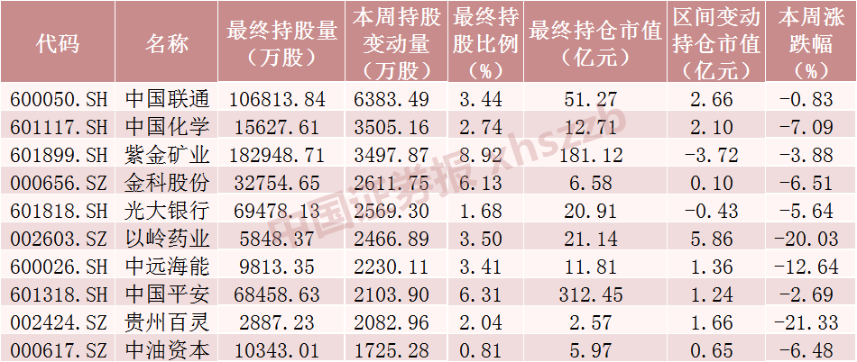 从北向资金持股情况来看,Choice数据显示,截至12月23日,北向资金持仓市值为2.21万亿元,本周北向资金持仓市值减少713亿元。本周北向资金对644只股票的持股数增加,对其中26只股票的持股增加数超过1000万股,持股增加数最多的中国联通增加了6383.49万股,对中国化学、紫金矿业持股分别增加3505.16万股、3497.87万股。