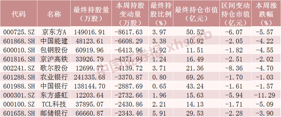 Choice数据显示,本周北向资金共计减仓1035只股票,对其中44只股票的减仓股数超过1000万股。减仓股数最多的京东方A被减仓8617.63万股,中国能建、包钢股份被分别减仓6608.29万股、6413.96万股。