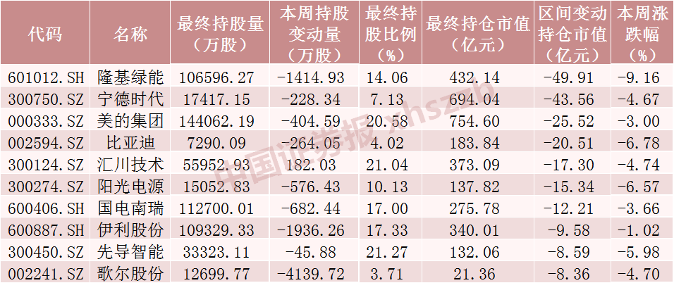 从市场表现上来看,本周北向资金持仓市值减少额居前十的股票均下跌,隆基绿能跌幅最大,本周下跌9.16%。