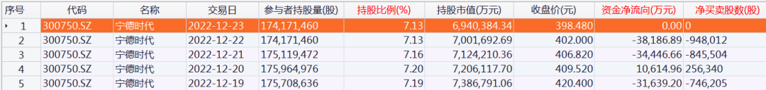 Choice数据显示,截至12月23日,北向资金持有宁德时代1.74亿股,宁德时代股价为398.48元/股,总市值为9733亿元。