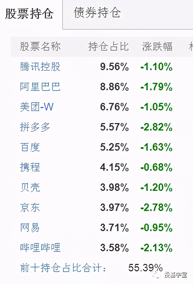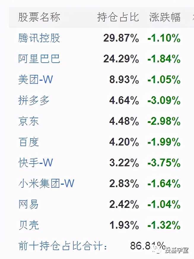 2.首先来看场内ETF,是:易方达中概互联50ETF(513050)中概互联ETF的前十大持仓如下:从中概互联前十大持仓来看,腾讯控股和阿里巴巴这两家上市公司就占了54%左右的仓位,权重占比相当大