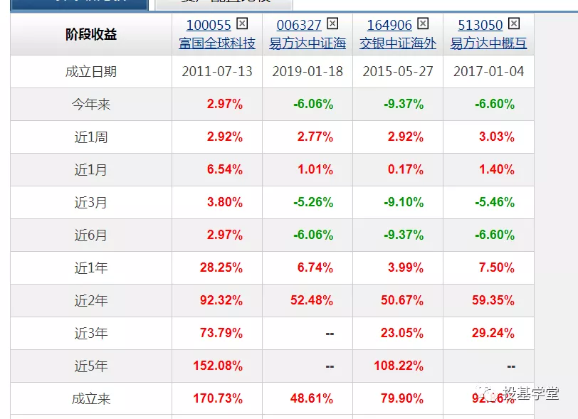 4.(交银中证海外互联的前十持仓)(富国全球科技互联的前十持仓)下面再对比下三只基金的业绩情况:为什么同样是中概互联主题的基金收益有区别呢,主要还是持仓和跟踪的标的不同,易方达中概互联跟踪的指数是中证海外中国互联网50人民币指数;交银中证海外互联跟踪的是中证海外中国互联网指数;而富国全球互联这只基金是一只主动型基金