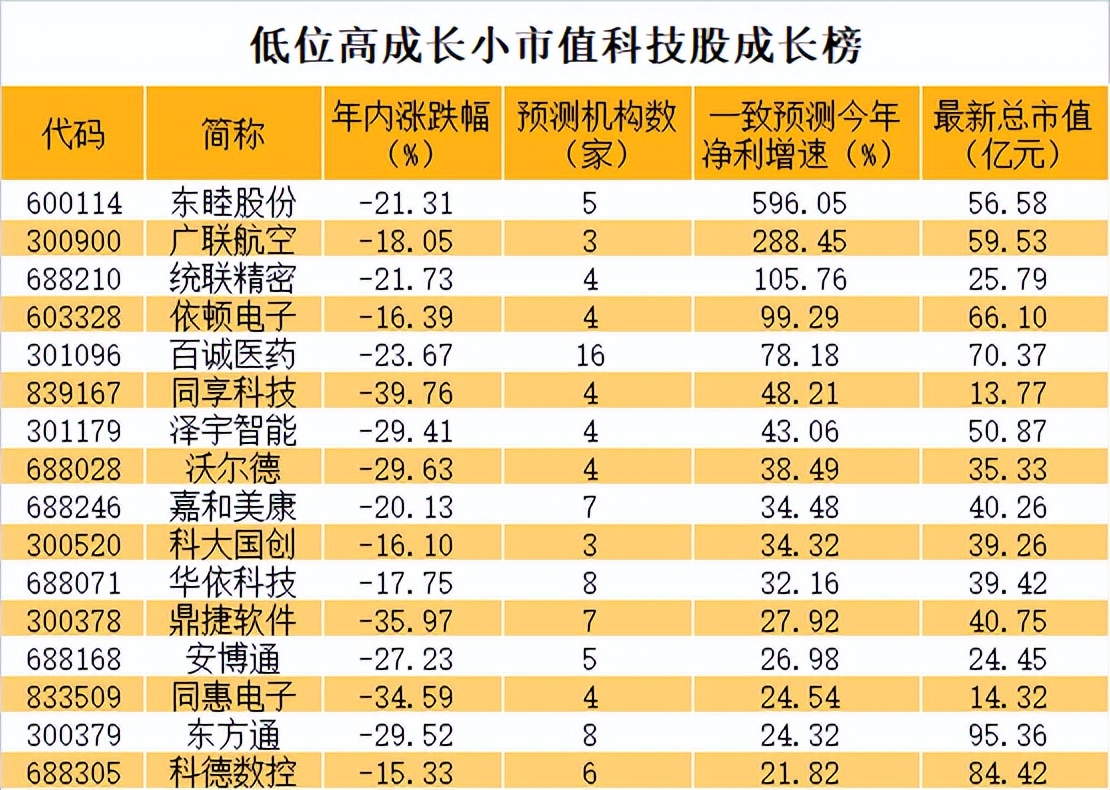 近期两大科创指数大幅反弹,12月26日创业板指涨近2%,科创50指数涨超3%,昨日两大指数再度涨超1%。兴业证券认为,自11月以来,市场风格显著分化,成长股持续回调。而调整至今,随着悲观预期释放,拥挤度显著回落,成长股相对性价比已再度显现,对于其中的高性价比方向,又到了可以重点掘金、布局的时间。据此,数据宝梳理出低位的高成长小市值科技股,以飨读者。