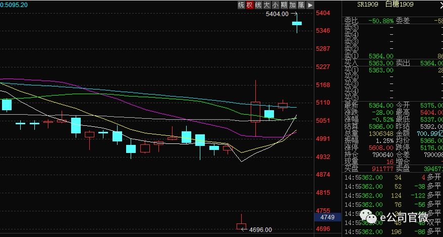 郑糖期货主力1909合约也现上攻姿态。4月份,白糖1909最高升至5404元/吨,创下去年7月以来新高,最新收报5364元/吨,今年以来累计涨逾10%,成交额更是突破700亿。