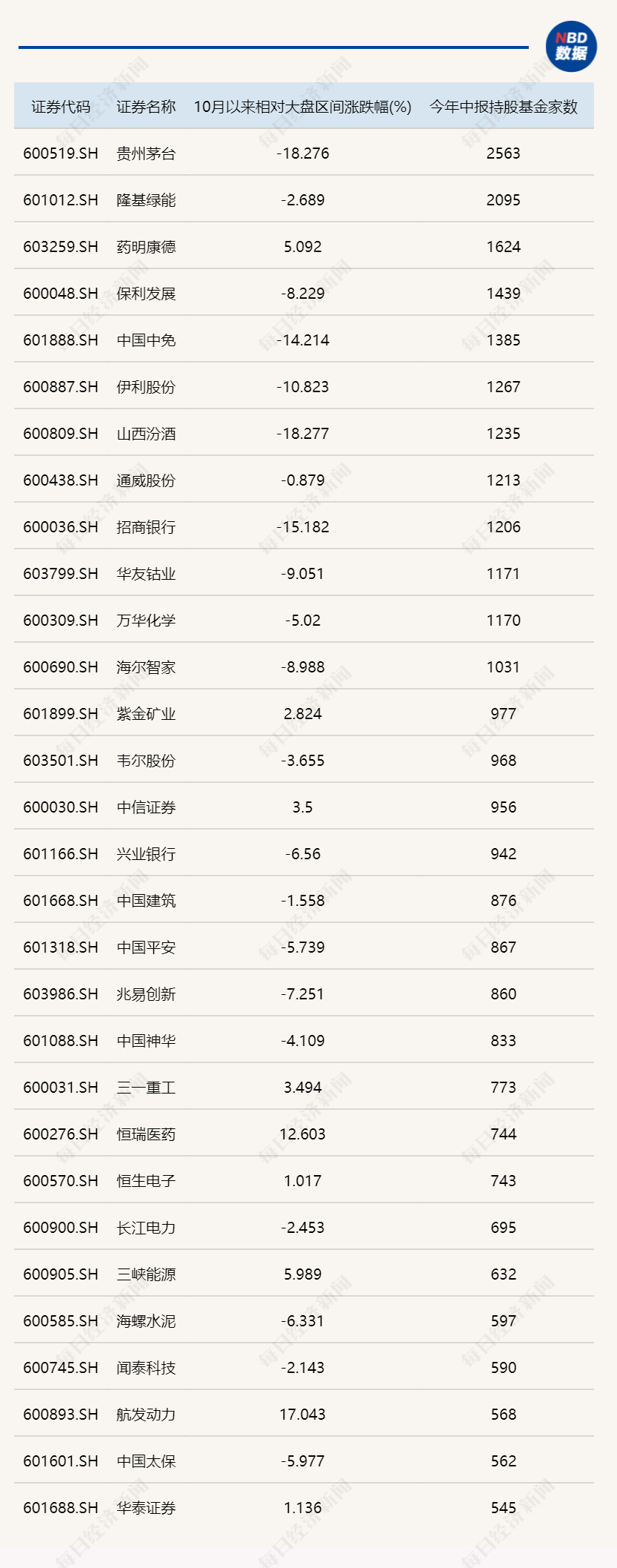 10月以来部分基金重仓股相对大盘表现↓