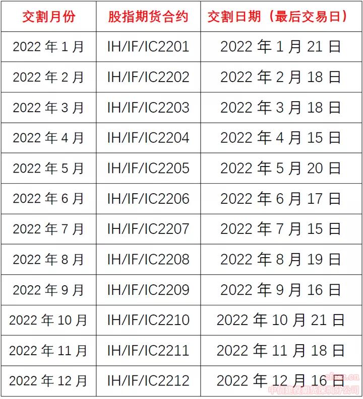 1.下面是2022年各月份股指期货交割时间以下是统计2021年各月份股指期货交割日对上证指数影响:合约 日期 当日上证2102合约 2021-2-19 0.57%2103合约 2021-3-19 -1.69%2104合约 2021-4-16 0.81%2105合约 2021-5-21 -0.58%2106合约 2021-6-18 -0.01%2107合约 2021-7-16 -0.71%2108合约 2021-8-20 -1.1%2109合约 2021-9-17 0.19%2110合约 2021-10-15 0.4%2111合约 2021-11-19 1.13%2112合约 2021-12-17 -1.07%经统计会发现,上涨5次,下跌6次