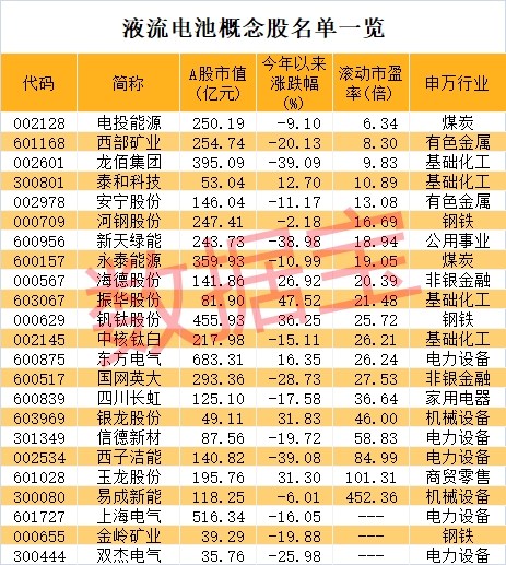 证券时报·数据宝统计,A股市场上布局液流电池业务的公司有23家,超半数公司今年前三季度净利润同比增长。易成新能、泰和科技、海德股份、永泰能源等净利润翻倍增长。从估值水平来看,截至11月4日收盘,逾六成概念股滚动市盈率低于30倍。电投能源、西部矿业、龙佰集团等3股滚动市盈率低于10倍。
