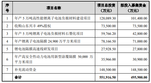据了解,去年12月29日,璞泰来还拟募资8.7亿元,主要投向锂电池用功能涂层隔膜生产基地建设项目、年产3万吨锂电池负极材料(炭化等主要工序)项目。