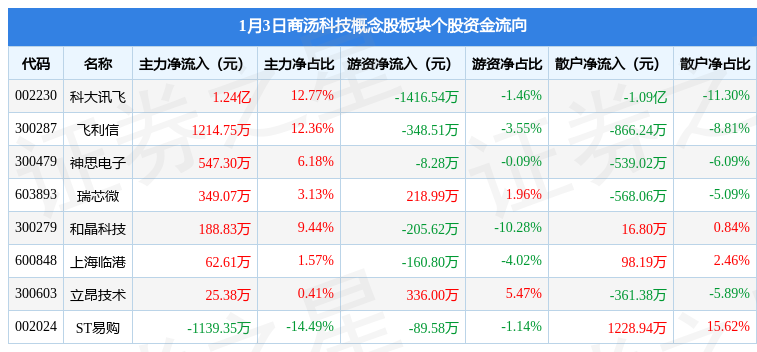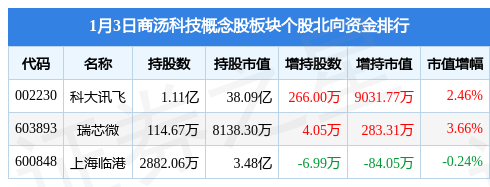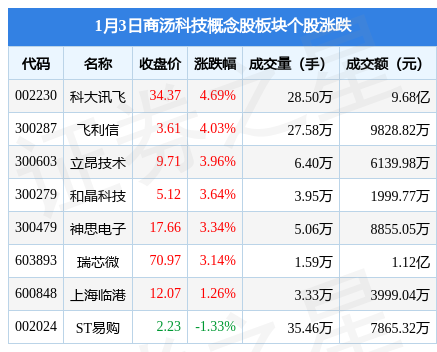 1.1月3日商汤科技概念股板块较上一交易日上涨3.0%,科大讯飞领涨。