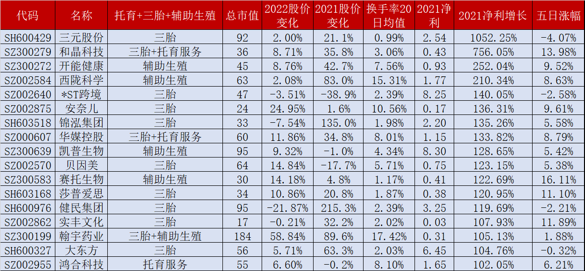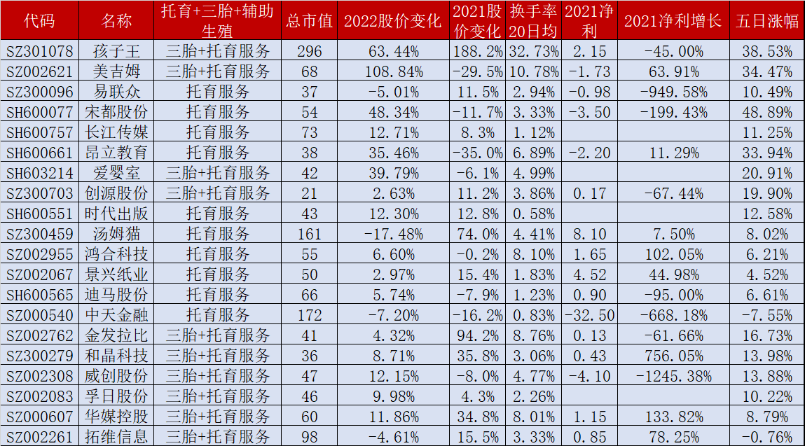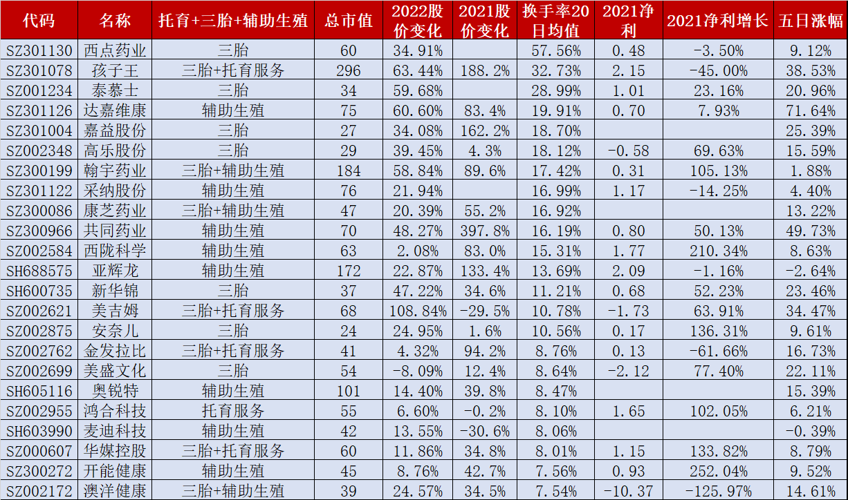 1.两会期间三胎以及幼儿的抚养成为了热门研究问题,为此本文对41只辅助生殖概念股、88只三胎概念股、20只托育服务概念股进行合并解析,具体情况如下:(1)20只托育服务概念股3月7日走出全线上涨行情【名单如下】,孩子王、和晶科技、宋都股份、长江传媒、昂立教育、华媒控股、威创股份7股涨停(2)29只辅助生殖概念股近5日股价上涨、11股近5日股价涨幅超10%【达嘉维康、悦心健康、共同药业、长江健康、重药控股、赛托生物、奥锐特、澳洋健康、康芝药业、圣诺生物、贝瑞基因】(3)66只三胎概念股近5日股价上涨、8股近5日股价涨幅超20%【孩子王、美吉姆、长江健康、嘉益股份、新华锦、美盛文化、泰慕士、爱婴室】(4)10股为三胎叠加了托育服务:孩子王、美吉姆、爱婴室、创源股份、金发拉比、和晶科技、威创股份、孚日股份、华媒控股、拓维信息,除华媒控股、拓维信息2股外其余8股近5日股价涨幅超10%(5)7股为三胎叠加了辅助生殖:长江健康、澳洋健康、康芝药业、圣诺生物、华邦健康、翰宇药业、华大基因,近5日股价除华大基因股价下跌外其余6股均上涨(6)96股市值不足100亿【其中仅13.54%即13股近5日股价下跌】、14股市值不足30亿、6股市值不足25亿【实丰文化、创源股份、茶花股份、西部牧业、奇德新材、安奈儿】,34股为百亿级市值股【达到20股近5日股价下跌】,2只千亿级市值股【伊利股份+复星医药】(7)近20日换手率均值为4.86%【高于大盘】,57股近20日换手率均值超5%,23股近20日换手率均值超6%【如下图】,7只非2022上市股近20日换手率均值超16%【孩子王、达嘉维康、嘉益股份、高乐股份、翰宇药业、康芝药业、共同药业】(8)92股发布年报预告或年报快报,17股年报预告净利同比翻番、4股年报预告净利同比增长超200%#三胎##辅助生殖##托育服务#