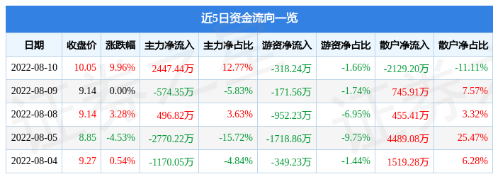 3.资金流向数据方面,8月10日主力资金净流入2447.44万元,游资资金净流出318.24万元,散户资金净流出2129.2万元。