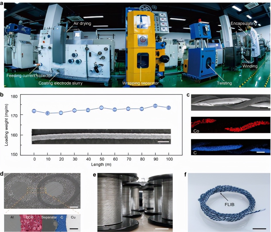 图. (a)分别为纤维锂离子电池连续化制备装置;(b)纤维锂离子中电池活性材料的高效连续涂覆;(c-f) 纤维锂离子电池的连续化构建。