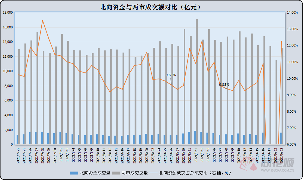 成交量方面,两市合计成交金额13215亿元,成交额较前一交易日上升明显。北向资金成交量为1620亿元,占比A股总成交量的比重为12.26%。
