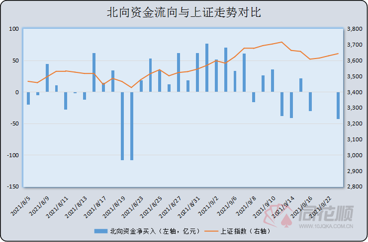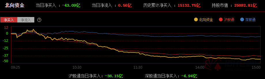 具体来看,北向资金今日合计净卖出43.03亿元,其中沪股通净卖出38.15亿元,深股通净卖出4.94亿元。