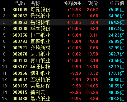 9月23日盘中,造纸板块早盘冲高,截至收盘板块涨幅超过9%,板块中可靠股份(301009)20CM涨停,景兴纸业(002067)、岳阳林业、华泰股份(600308)、恒丰纸业(600356)、宜宾纸业(600793)等多股涨停。