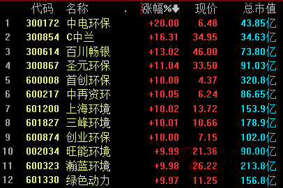 值得一提的是,相比昨日主炒风、光、水电,今日绿色电力盘面上还出现了一定的扩散,不少垃圾发电个股异军突起,绿色动力(601330)、三峰环境(601827)、瀚蓝环境(600323)、旺能环境(002034)等多股涨停,相关环保个股也强势跟涨。