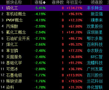 9月23日,磷化工、炭黑、纯碱、甲醇、氟化工、有机硅等涨价题材板块纷纷高开低走,多只个股闪崩跌停。包括磷化工概念股云图控股(002539)、云天化(600096)、川恒股份(002895),有机硅概念股宏柏新材(605366),纯碱概念股中盐化工(600328),氟化工中中欣氟材(002915)。