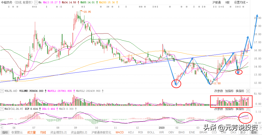 从日K线上看,在5月6日放量突破了200日均线后,股价打开了上行的空间,并且多空围绕200日均线展开争夺,多头战胜空头,逐步上行。形态上,头肩底形态的颈线位已经放量突破,量能稳步放量,MACD指标双线金叉沿着零轴上方运行,红柱不断放量,从运行轨迹上看,股价上行动能充足。根据头肩底形态测算,最小目标19.5,最大目标26.7。若回踩颈线位不破可以考虑逢低介入。