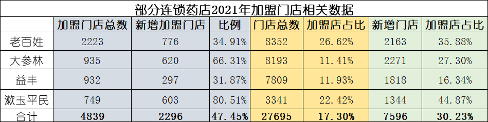根据企业年报,截至2021年末,老百姓、大参林、益丰、漱玉平民这4家上市连锁新增加盟门店合计2296家,占到加盟门店总数近50%。