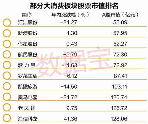 一些大消费板块的市值还非常低,或许说明这个行业具有更广阔的成长空间,当然这同时也意味着较大的竞争风险。数据显示,汇洁股份最新A股市值55.09亿元,榜单最低。该股属于纺织服装行业中的其他服装行业,主营业务为内衣生产销售。新澳股份最新A股市值不足58亿元,主营业务为毛精纺纱线的研发、生产和销售。伟星股份最新市值62.27亿元,主营专业从事钮扣、拉链、金属制品等服装辅料的研发、制造与销售。