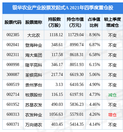 7.银华农业产业股票发起式A的前十大重仓股如下:以上内容由证券之星根据公开信息整理,如有问题请联系我们
