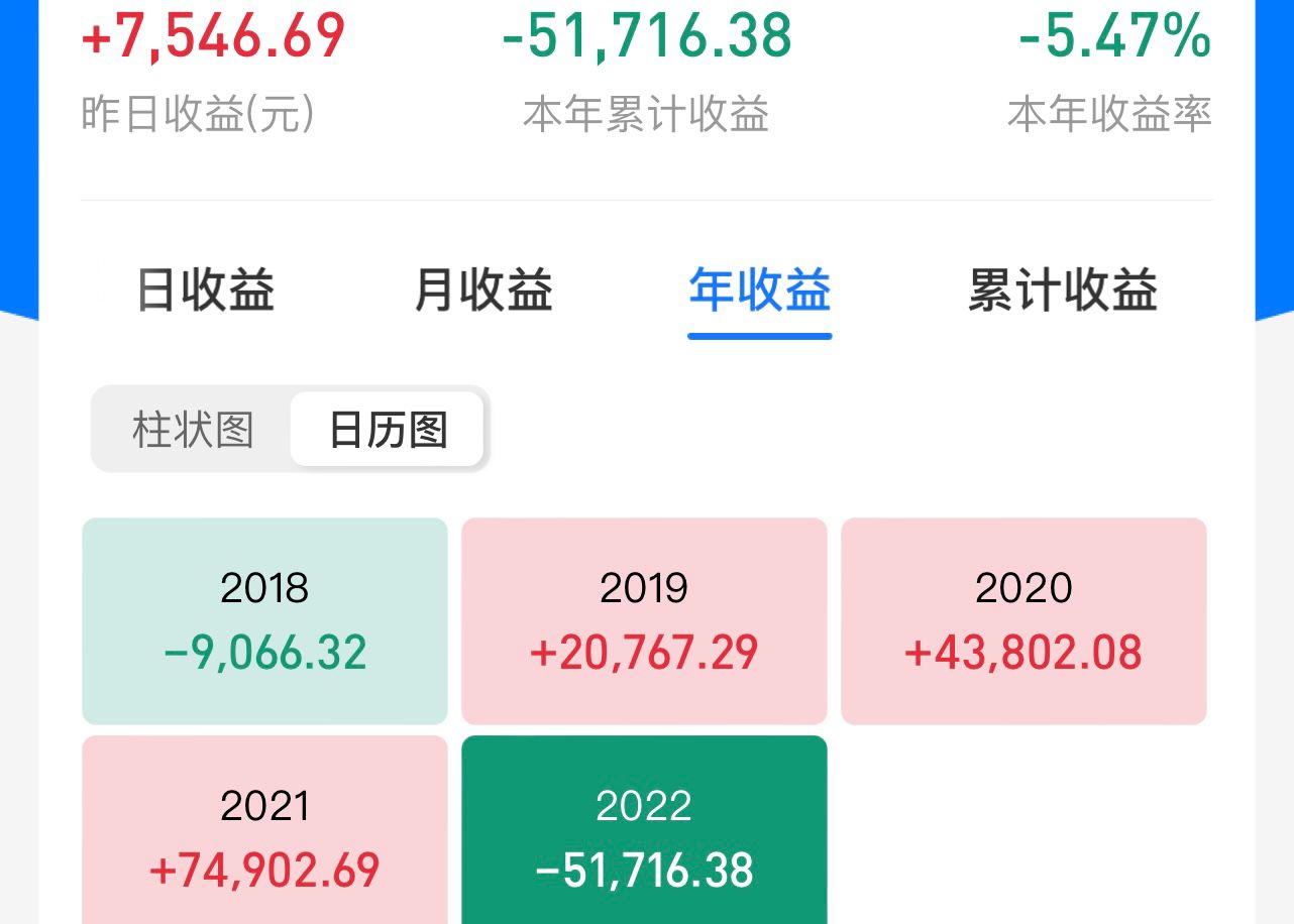 今年以来收益率-5.47%(历史记录:2018年投资总仓位10万,2019年投资总仓位20万,2020年投资总仓位30万,2021年投资总仓位50万)