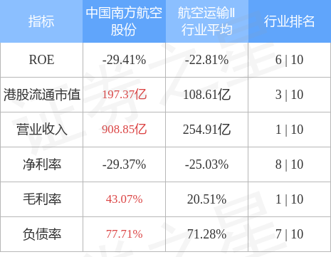 5.机构评级详情见下表:中国南方航空股份港股市值197.37亿港元,在航空运输Ⅱ行业中排名第3。