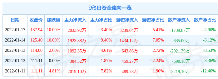 3.资金流向数据方面,当日主力资金净流入2033.92万元,游资资金净流入3239.04万元,散户资金净流出1739.87万元。