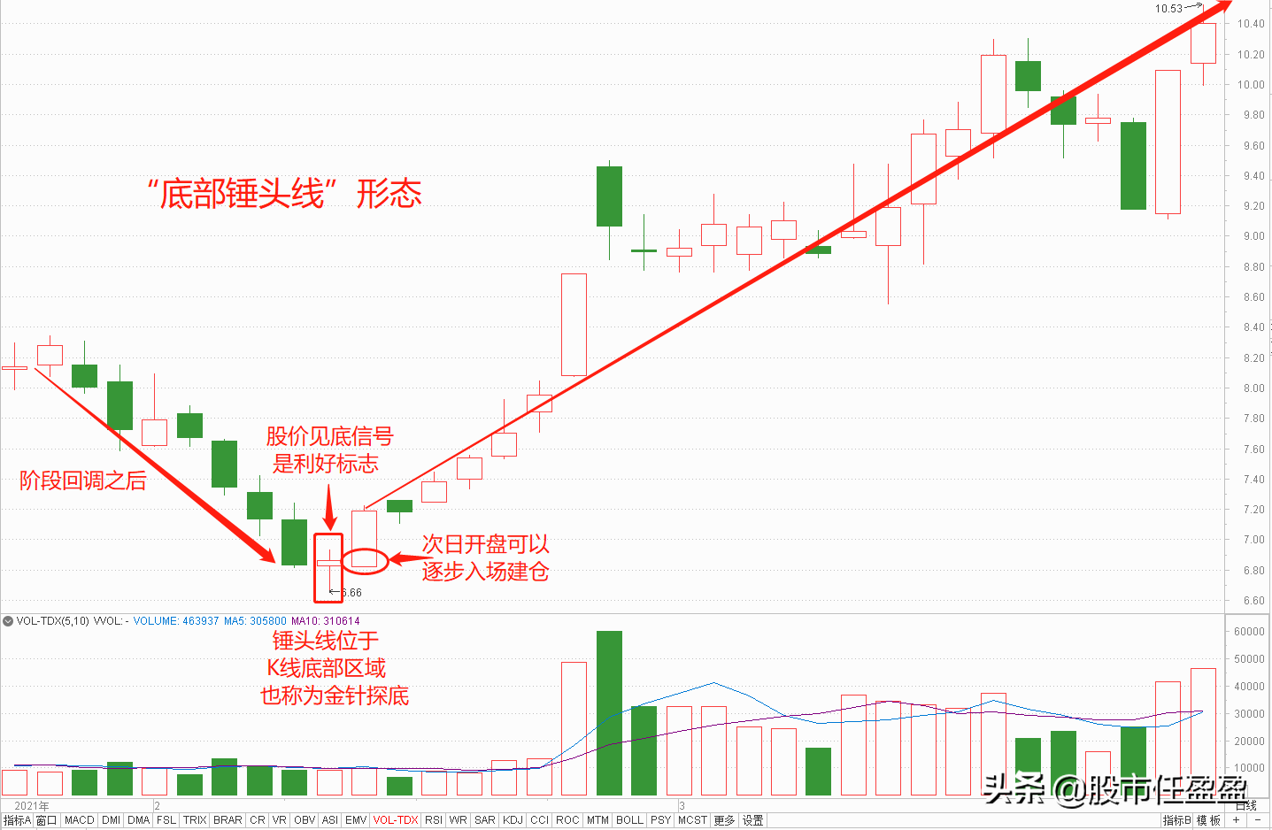 7.以上就是对于“底部锤头线”操作要点的分析,为了让大家更好的理解运用,盈盈在文章下方用K线做了图文分析,朋友们可以仔细研究并收藏。