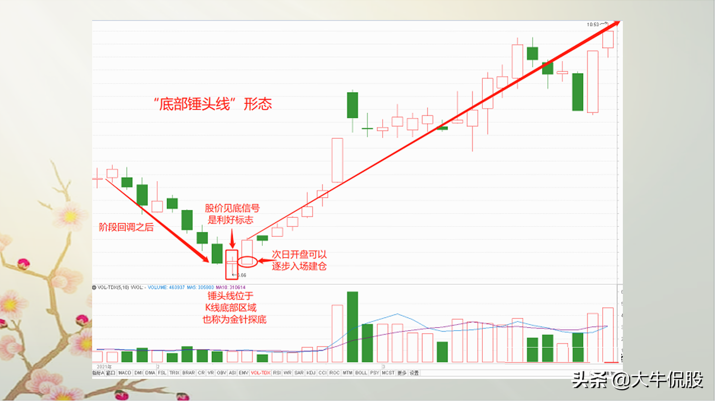 3.出现在下降趋势中,代表下降趋势即将结束,开始企稳反弹。