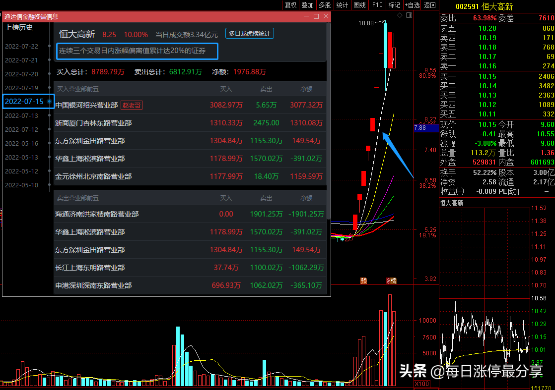 还是拿恒大高新举例:7.13收盘价 6.82,7.15收盘价 8.25。