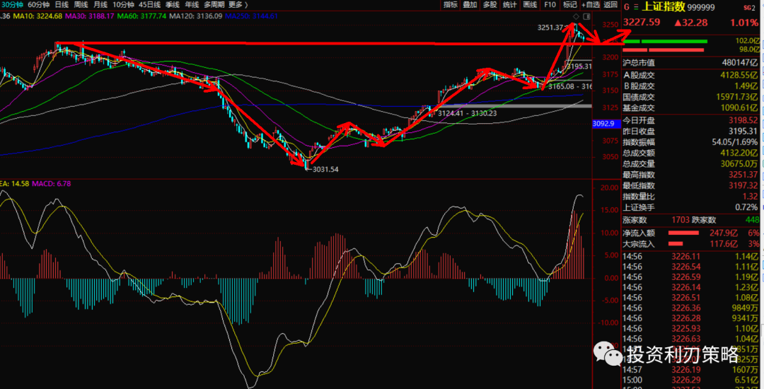 8.上证指数30分钟K线走势分解:指数突破前高,小幅回踩,等待回踩确认后反弹。