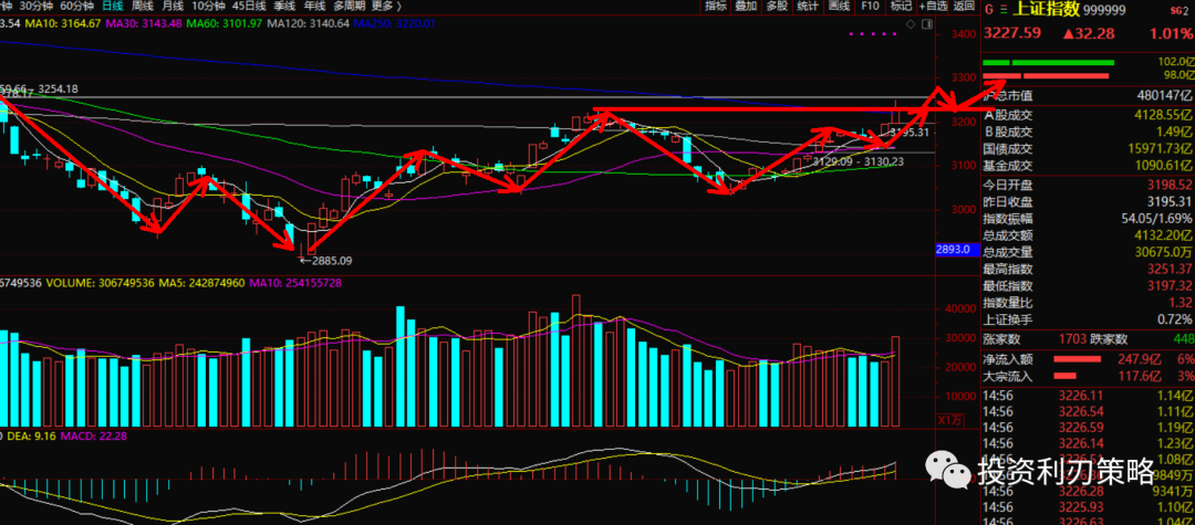 7.上证指数日K线走势分解:指数今日突破年线3220点,午后回落,这里突破年线面临短期的回踩确认,等进一步确认后,有望继续反弹。