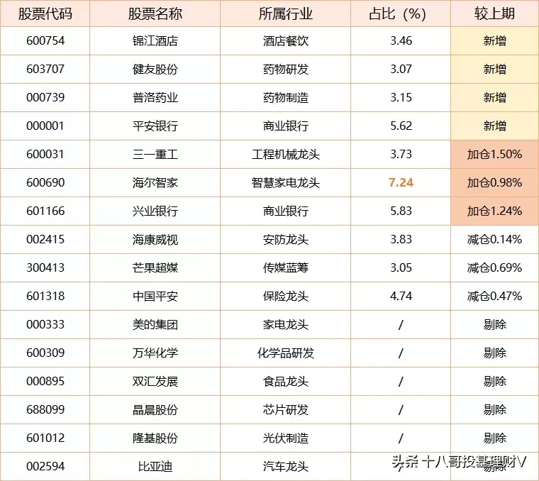 6.当前占比前十股票:海尔智家(智慧家电龙头)、兴业银行(商业银行)、平安银行(商业银行)、中国平安(保险龙头)、海康威视(安防龙头)、三一重工(工程机械龙头企业)、锦江酒店(酒店餐饮)、普洛药业(大型综合性制药企业)、健友股份(药物研发)、芒果超媒(传媒蓝筹公司)。