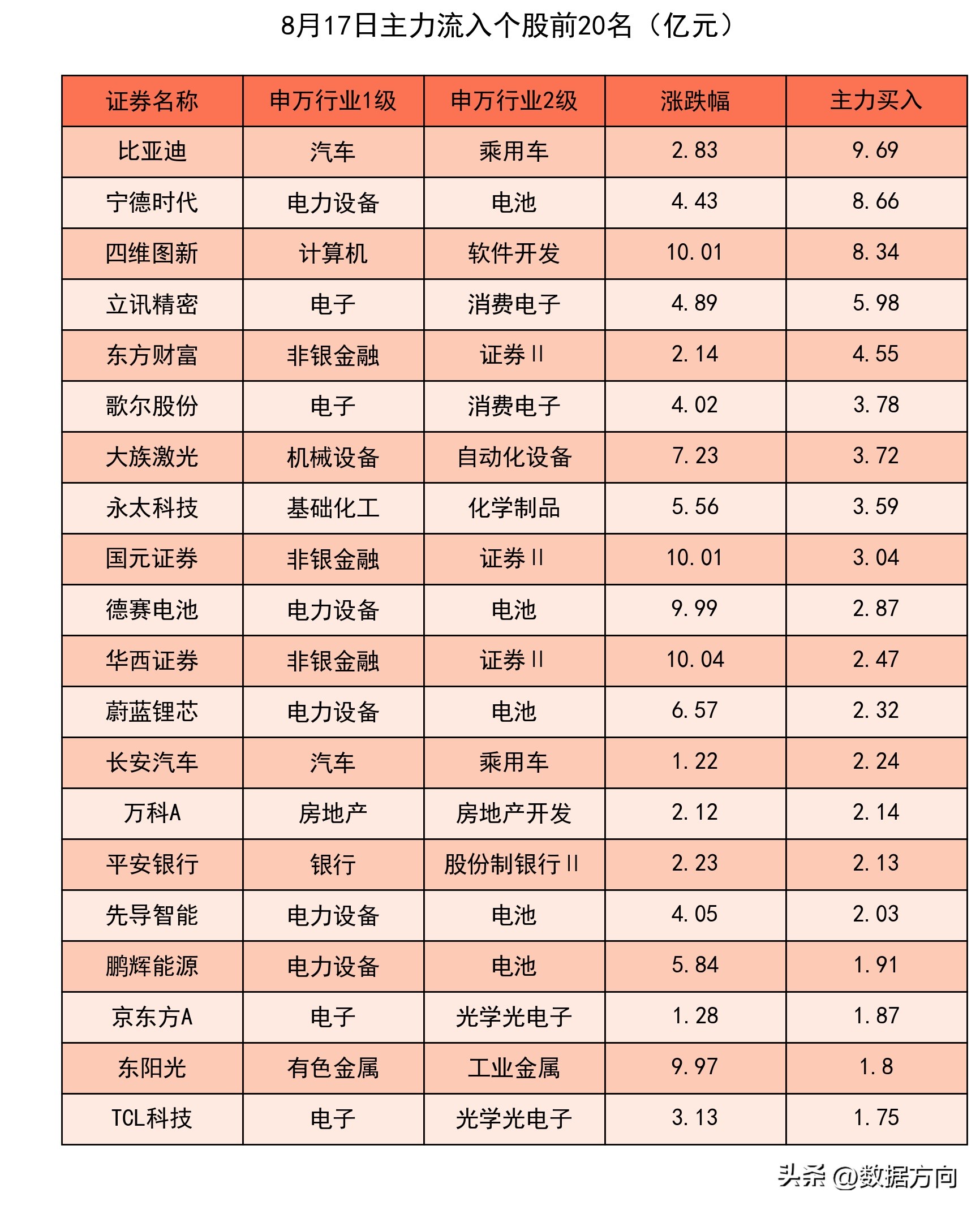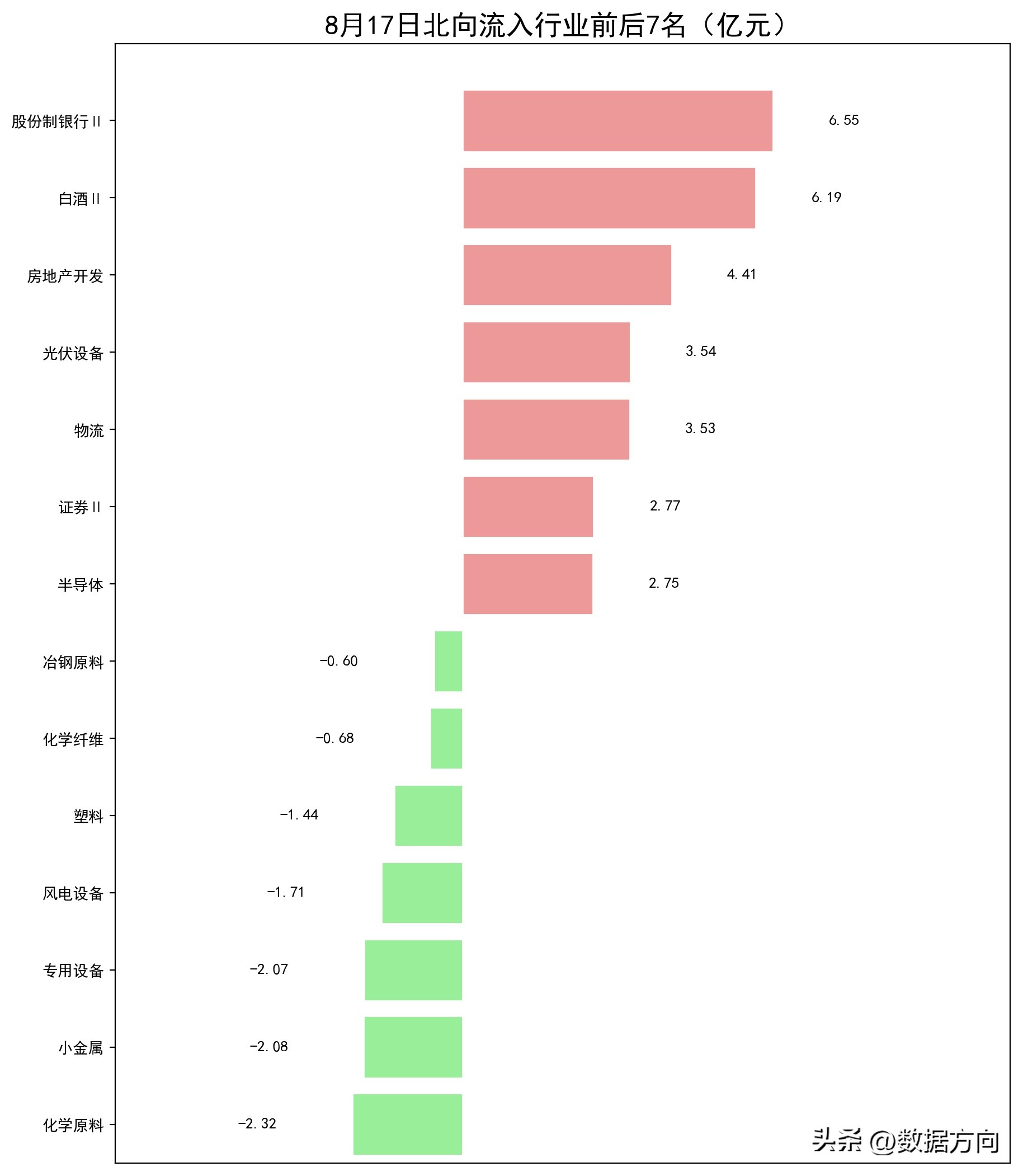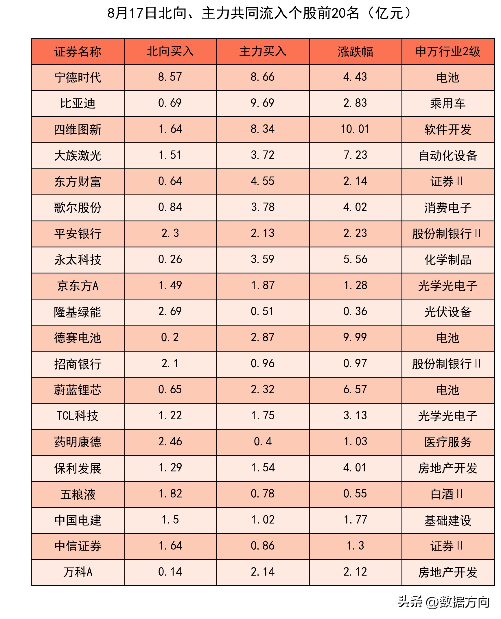 1.8月17日市场资金流向证券、股份制银行、白酒、房地产开发、消费电子、乘用车……1.主力和北向共同流入的行业1)证券,主力流入16.92亿,北向流入2.77亿,行业上涨率100.0%,大资金持仓约为标配的107.94%,近4周流入3周,近2周全部流入;2)股份制银行,主力流入4.27亿,北向流入6.55亿,行业上涨率100.0%,大资金持仓约为标配的104.0%,近4周流入2周,近2周全部流入;2.北向买入榜排名靠前的行业3)白酒,北向流入6.19亿,行业上涨率90.0%,大资金持仓约为标配的160.93%,近4周流入3周,近2周持续流入;4)房地产开发,北向流入4.41亿,行业上涨率74.77%,大资金持仓约为标配的78.76%,近4周流入2周,近2周持续流入;5)光伏设备,北向流入3.54亿,行业上涨率54.35%,大资金持仓约为标配的134.72%,近4周流入1周;6)物流,北向流入3.53亿,行业上涨率42.22%,大资金持仓约为标配的105.95%,近4周流入2周,近2周持续流入;7)半导体,北向流入2.75亿,行业上涨率52.83%,大资金持仓约为标配的130.96%,近4周流入3周,近2周持续流入;3.主力买入榜排名靠前的行业8)消费电子,主力流入13.08亿,行业上涨率54.22%,大资金持仓约为标配的150.13%,近4周流入2周;9)乘用车,主力流入12.13亿,行业上涨率87.5%,大资金持仓约为标配的60.94%,近4周流入2周,近2周持续流入;10)光学光电子,主力流入8.36亿,行业上涨率66.67%,大资金持仓约为标配的95.17%,近4周流入2周;11)电池,主力流入5.87亿,行业上涨率52.24%,大资金持仓约为标配的154.55%,近4周全部流入;12)种植业,主力流入4.84亿,行业上涨率85.0%,大资金持仓约为标配的45.95%,近4周流入2周;4.主力和北向共同流出的行业13)小金属,主力流入-10.38亿,北向流入-2.08亿,行业上涨率4.17%,大资金持仓约为标配的49.51%,近4周流入2周;14)化学原料,主力流入-9.74亿,北向流入-2.32亿,行业上涨率21.82%,大资金持仓约为标配的50.01%,近4周流入2周;