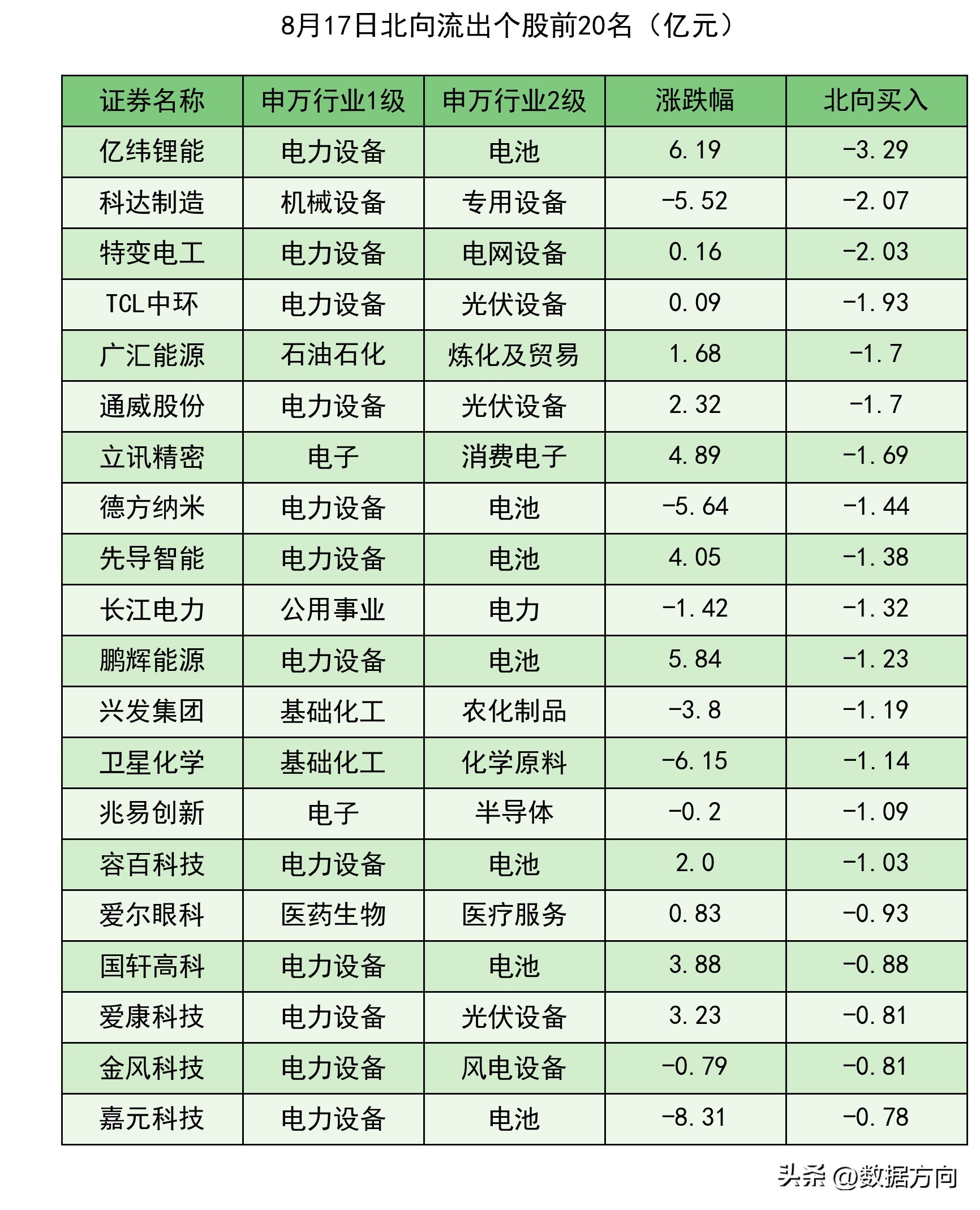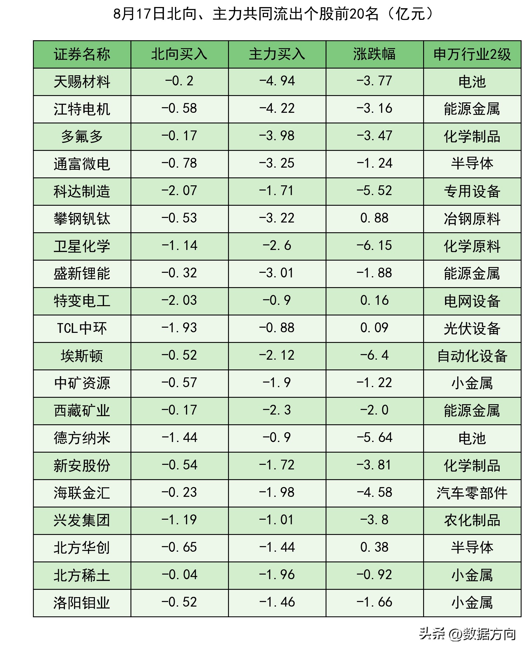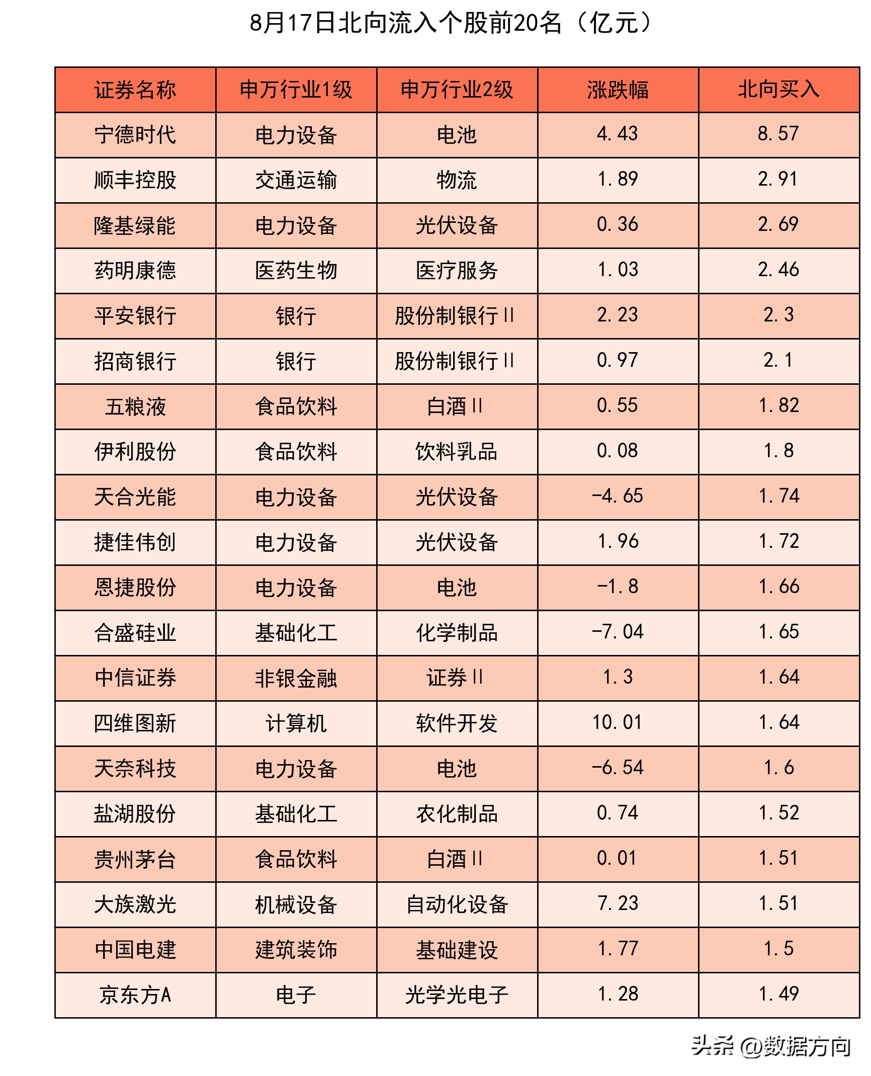 1.8月17日市场资金流向证券、股份制银行、白酒、房地产开发、消费电子、乘用车……1.主力和北向共同流入的行业1)证券,主力流入16.92亿,北向流入2.77亿,行业上涨率100.0%,大资金持仓约为标配的107.94%,近4周流入3周,近2周全部流入;2)股份制银行,主力流入4.27亿,北向流入6.55亿,行业上涨率100.0%,大资金持仓约为标配的104.0%,近4周流入2周,近2周全部流入;2.北向买入榜排名靠前的行业3)白酒,北向流入6.19亿,行业上涨率90.0%,大资金持仓约为标配的160.93%,近4周流入3周,近2周持续流入;4)房地产开发,北向流入4.41亿,行业上涨率74.77%,大资金持仓约为标配的78.76%,近4周流入2周,近2周持续流入;5)光伏设备,北向流入3.54亿,行业上涨率54.35%,大资金持仓约为标配的134.72%,近4周流入1周;6)物流,北向流入3.53亿,行业上涨率42.22%,大资金持仓约为标配的105.95%,近4周流入2周,近2周持续流入;7)半导体,北向流入2.75亿,行业上涨率52.83%,大资金持仓约为标配的130.96%,近4周流入3周,近2周持续流入;3.主力买入榜排名靠前的行业8)消费电子,主力流入13.08亿,行业上涨率54.22%,大资金持仓约为标配的150.13%,近4周流入2周;9)乘用车,主力流入12.13亿,行业上涨率87.5%,大资金持仓约为标配的60.94%,近4周流入2周,近2周持续流入;10)光学光电子,主力流入8.36亿,行业上涨率66.67%,大资金持仓约为标配的95.17%,近4周流入2周;11)电池,主力流入5.87亿,行业上涨率52.24%,大资金持仓约为标配的154.55%,近4周全部流入;12)种植业,主力流入4.84亿,行业上涨率85.0%,大资金持仓约为标配的45.95%,近4周流入2周;4.主力和北向共同流出的行业13)小金属,主力流入-10.38亿,北向流入-2.08亿,行业上涨率4.17%,大资金持仓约为标配的49.51%,近4周流入2周;14)化学原料,主力流入-9.74亿,北向流入-2.32亿,行业上涨率21.82%,大资金持仓约为标配的50.01%,近4周流入2周;