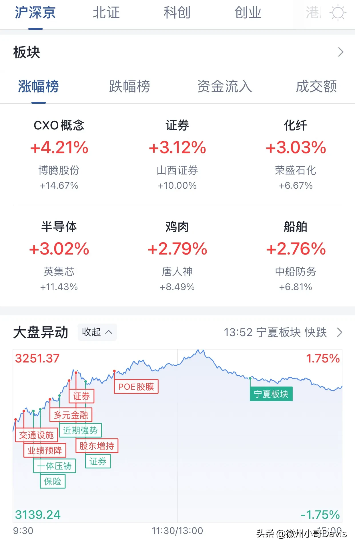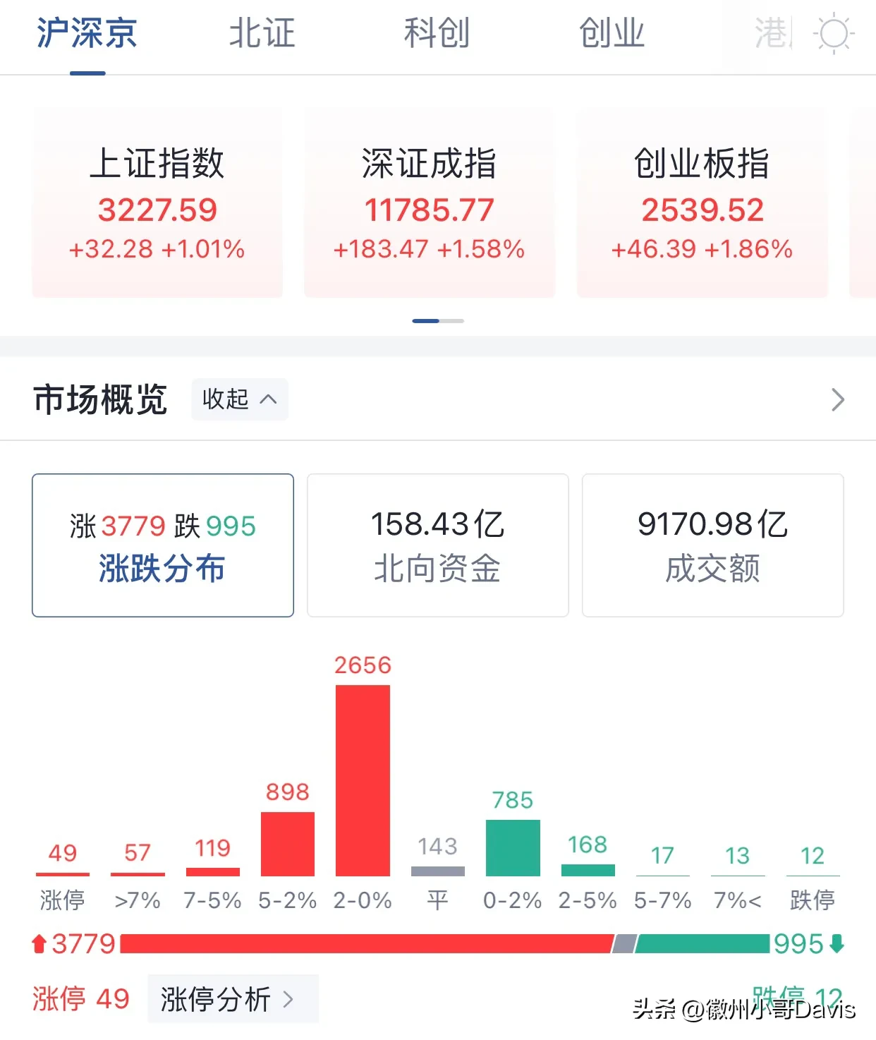 2.1、A股三大指数整体表现,今日A股三大指数集体高开,早盘市场震荡走高,沪指涨超1%重返3200点,深成指、创业板指涨超2%;下午盘A股小幅走高后回落,截至收盘,沪指涨1.01%,收3227.59点,深成指涨1.58%,收11785.77点,创业板指涨1.86%,收2539.52点。